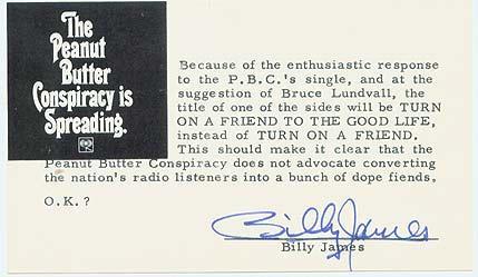 Postcard from the PBC's manager Billy James, stating: "the Peanut Butter Conspiracy does not advocate converting the nation's radio listeners into a bunch of dope fiends." |